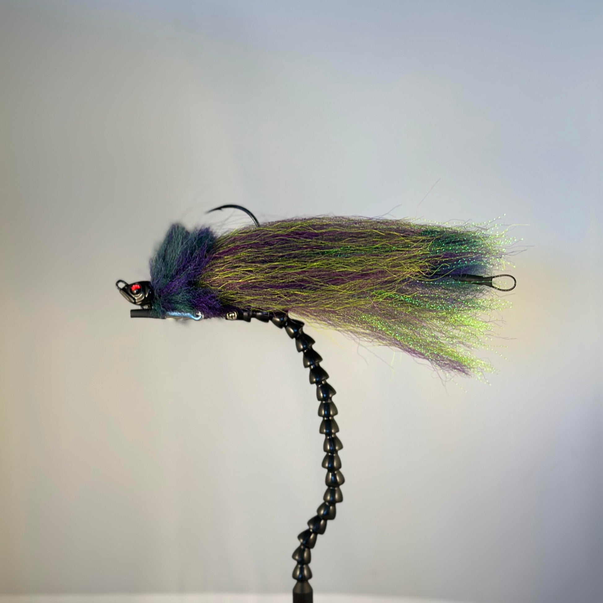 Green Goblin is a chaotic, high-impact predator fly built to trigger violent reaction strikes from territorial fish. Featuring a dark, bulky head and a wild mix of green, purple, and flash, it throws serious movement and disruption through the water.